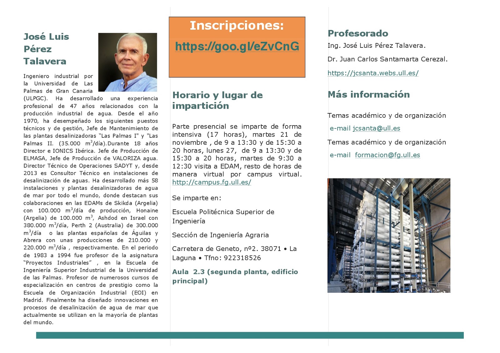 Fundamentos, diseño, construcción y mantenimiento de plantas desalinizadoras de agua de mar por osmosis inversa (OI) de 3 ECTS (2ª edición).
